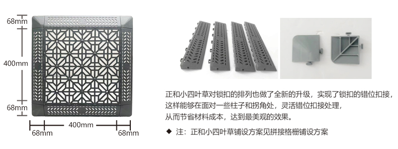 正和小四葉草采用通扣設(shè)計,可以確保產(chǎn)品鋪設(shè)完成后在任何區(qū)域單獨(dú)取出,極大的方便了客戶后期局部清理泥沙等,給店面的日常衛(wèi)生維護(hù)提供了很好的基礎(chǔ)。