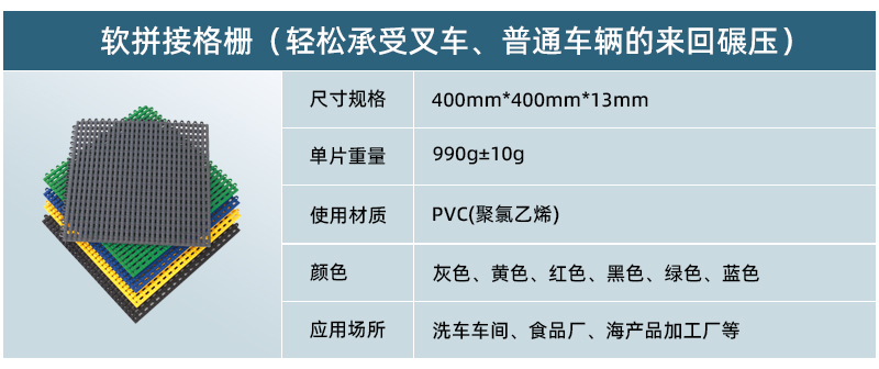 正和軟拼接格柵(專利號ZL201520725751.X)由加厚型實心條狀支撐縱橫交織,寬大的排水孔便于水和泥沙的排出和流動。下方密布數(shù)百個實心防滑支撐點,每平米承重高達10噸以上,輕松承受叉車、普通車輛的來回碾壓,特別適合在洗車車間、食品廠、海產(chǎn)品加工廠等有水地面,也可以作為企事業(yè)單位迎賓除塵墊使用。
