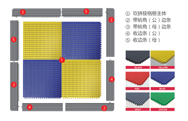正和軟拼接格柵整體為正方形結構,采用矩陣式密集鎖扣連接,扣接牢固,施工簡單,多種色彩可供搭配,鋪設之后整齊美觀。產(chǎn)品整體采用軟性材料,讓清掃衛(wèi)生變得更加簡單,只要將整體地面卷起即可清理下方地面,高效便捷。