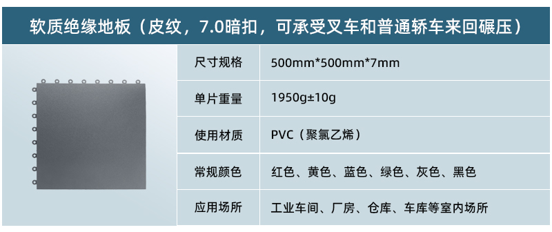 軟質(zhì)絕緣地板采用純新軟性PVC(聚氯乙烯)生產(chǎn)而成,具有防滑、防油、靜音、抗沖擊、高承載等特點(diǎn),可以快捷安裝在任何現(xiàn)有的基板,包括木材,混凝土,環(huán)氧樹脂,瓷磚,水磨石等,廣泛應(yīng)用于車間廠房地面、倉庫地面、車庫地面、健身房、展廳等場(chǎng)所。