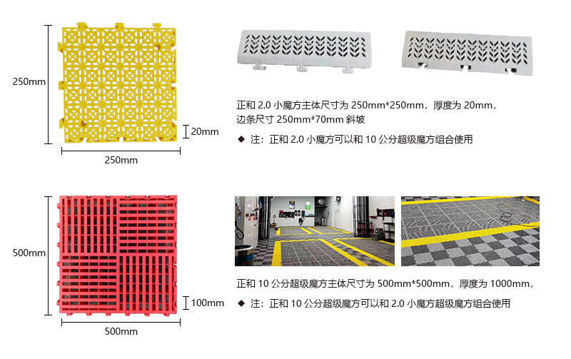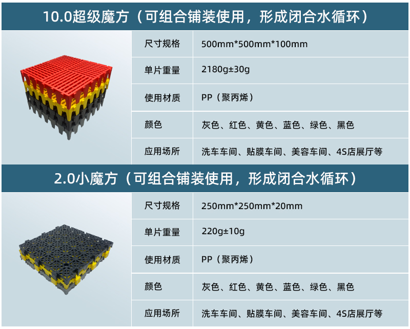 你以為60毫米厚度已經是終點?正和100毫米厚度【終級魔方】再次刷新認知!超強承載,極限容納泥沙量,嵌入式施工,讓洗車車間高效完美! 10公分終極魔方(50*50*10CM)與2.0小魔方(25*25*2CM)可組合鋪裝使用,形成閉合水循環(huán)